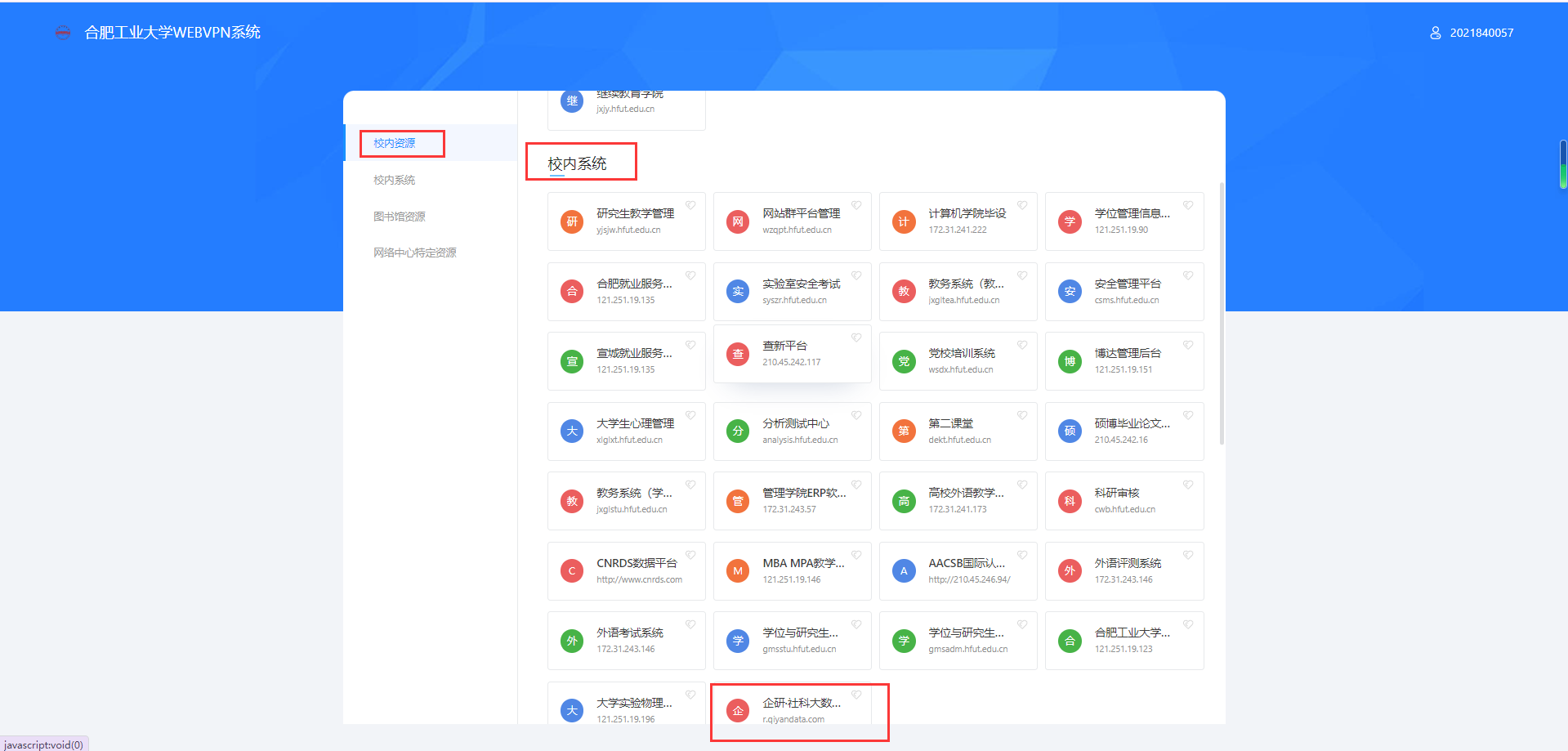 账号登录WebVPN→校内资源→校内系统→进入企研·社科大数据平台网站(校外)