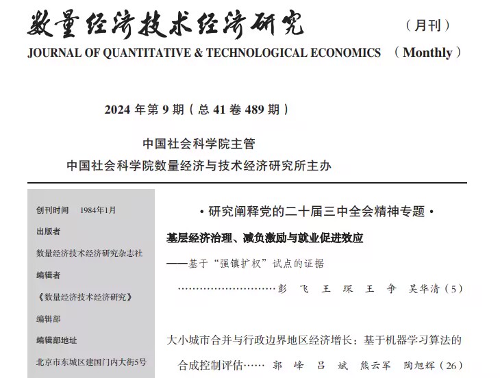 近日,qmh官网彭飞老师和吴华清老师论文《基层经济治理、减负激励与就业促进效应——基于“强镇扩权”试点的证据》在《数量经济技术经济研究》2024年第9期,作为首篇文章发表(合作者:王琛、王争、吴华清)。本论文得到国家自然科学基金面上项目(72273038)、国家社会科学基金重大项目(18ZDA064)和中央高校基本科研业务费专项资金项目(JZ2023HGPA0295)的资助。《数量经济技术经济研究》由中国社会科学院数量经济与技术经济研究所主办,是中国经济学和管理学权威期刊,涉及宏观经济、发展战略、政策评估、科技创新、数字经济、绿色低碳、模型方法等重要领域,2023年的复合影响因子为13.176。