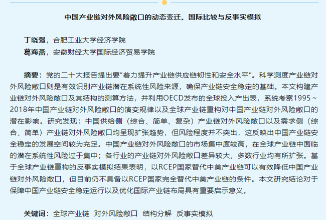 近日,qmh官网丁晓强老师论文《中国产业链对外风险敞口的动态变迁、国际比较与反事实模拟》在《数量经济技术经济研究》2024年第10期发表(合作者:葛海燕)。本论文得到教育部人文社会科学研究青年基金项目(23YJC790017)、国家社会科学基金重大项目(18ZDA064)、国家社会科学基金一般项目(21BJL066)和江苏现代服务业协同创新中心的资助。《数量经济技术经济研究》由中国社会科学院数量经济与技术经济研究所主办,是中国经济学和管理学权威期刊,涉及宏观经济、发展战略、政策评估、科技创新、数字经济、绿色低碳、模型方法等重要领域,2023年的复合影响因子为13.176
