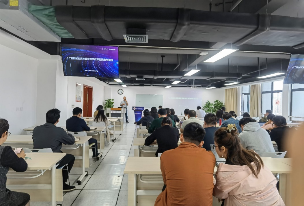 109日下午,qmh球盟会亚博网址在翡翠科教楼B1004举办了qmh球盟会亚博网址新文科建设教师工作坊——数字素养提升首场讲座,主题为“人工智能赋能高等教育教学改革的探索与实践”。学院邀请了清华大学学堂在线副总经理潘守东和清华大学雨课堂高级项目经理章翰,我校教务处副处长李平,学院党委书记张炳武出席了本次讲座。国际经济与贸易系系主任刘晴主持,学院教师参加了本次学习。