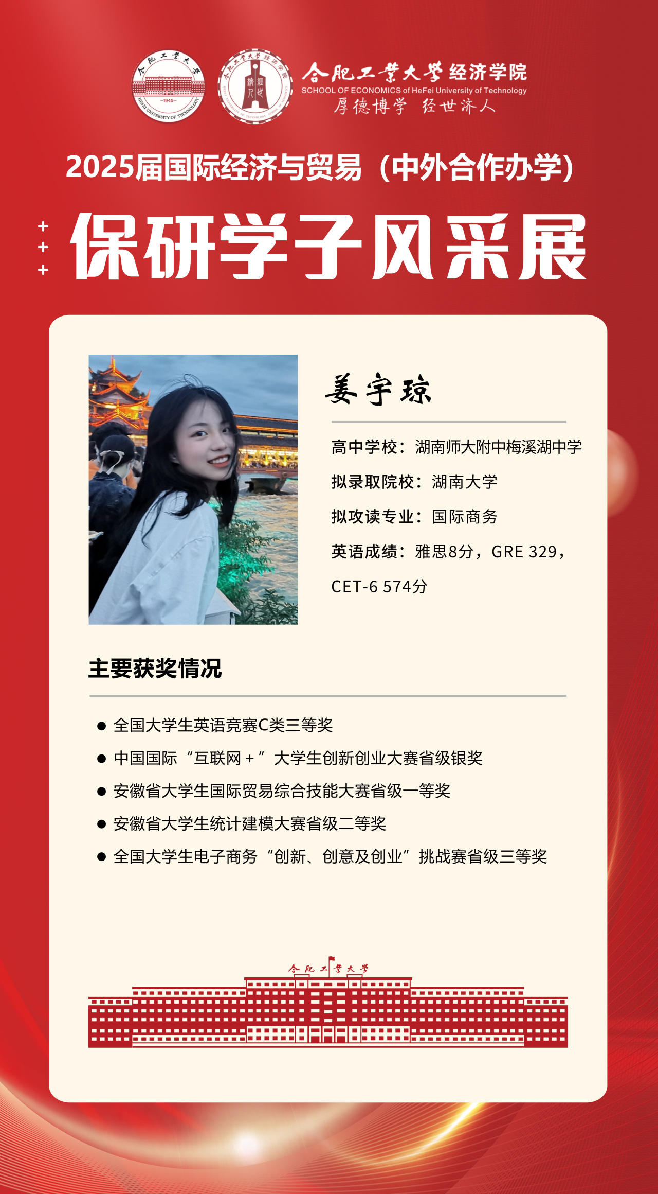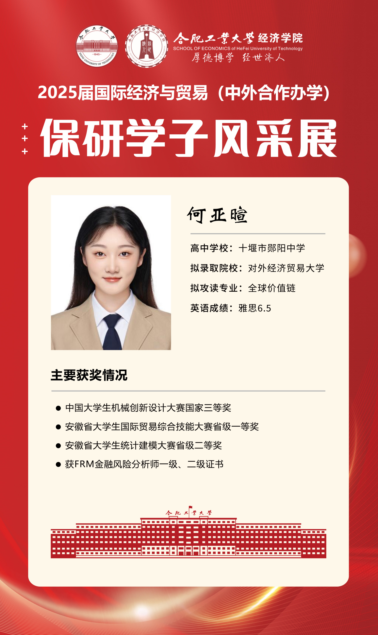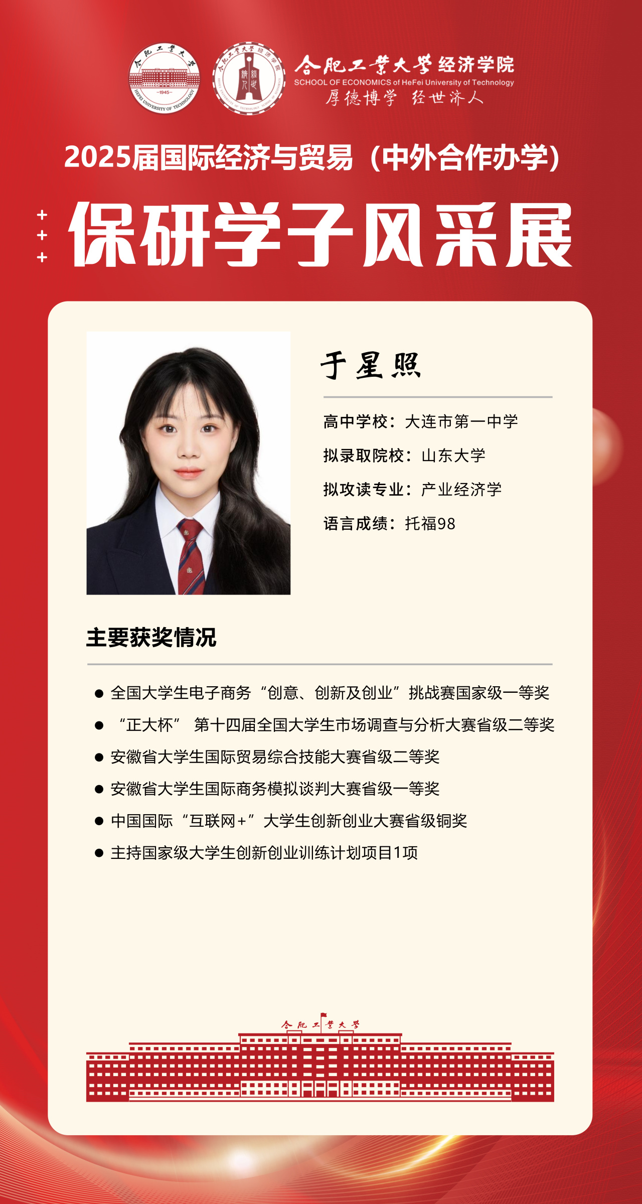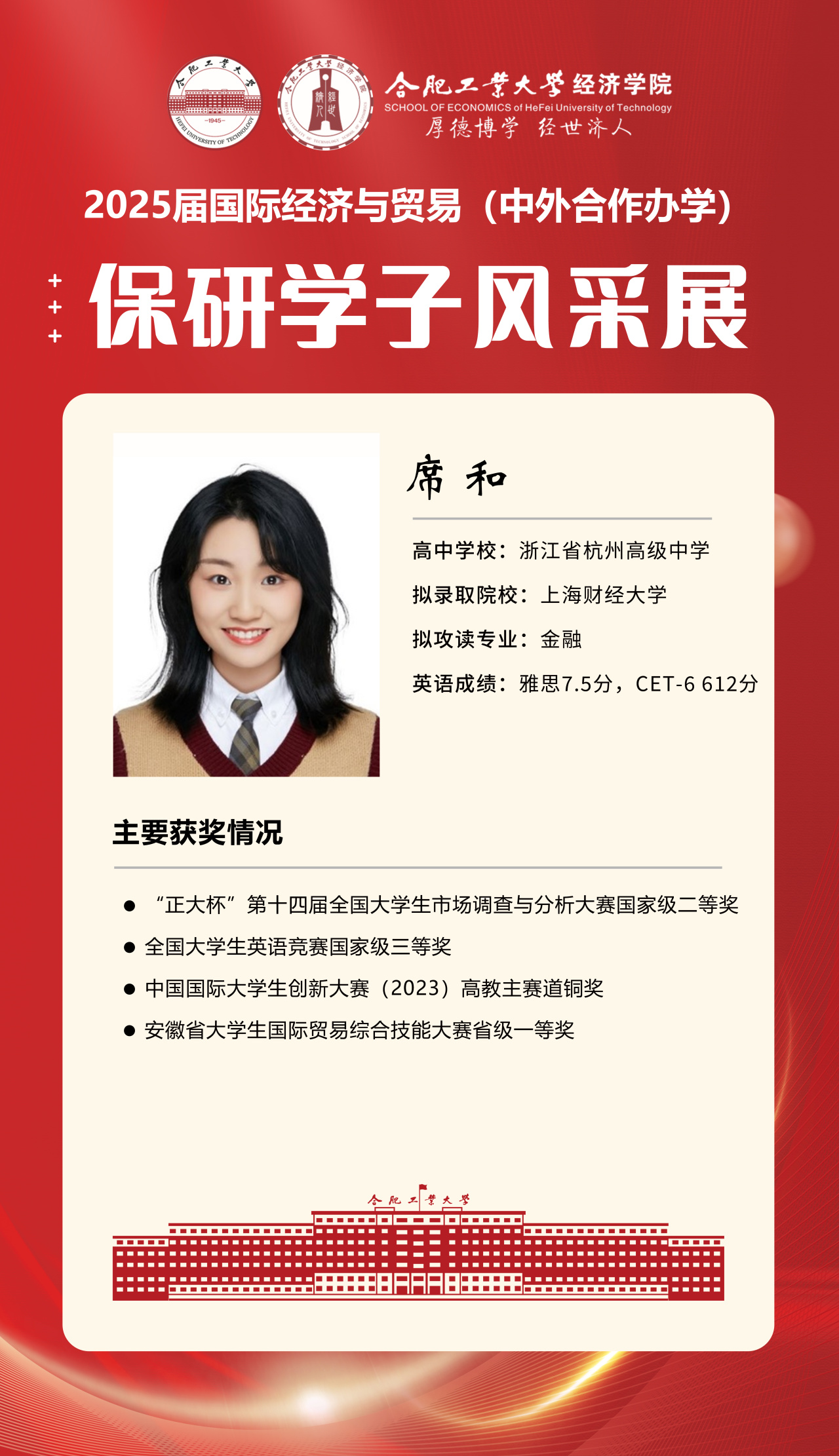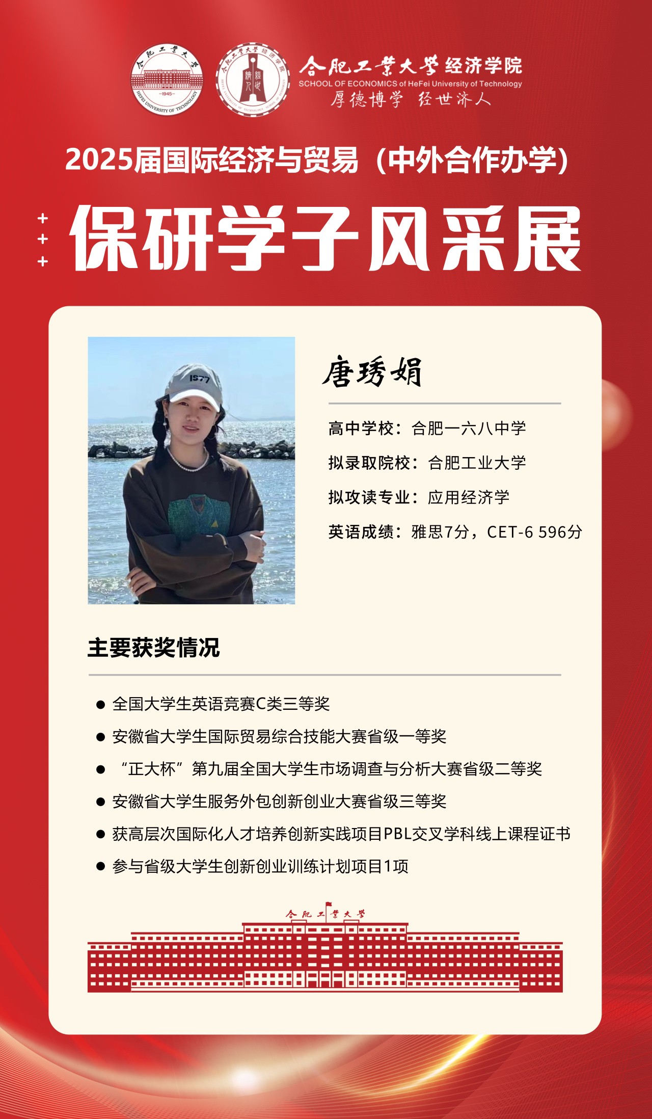 2025届球盟会qmh国际经济与贸易(中外合作办学)15名优秀推免生全部成功推免至中国科学技术大学、上海财经大学、对外经济贸易大学等“双一流”名校继续深造,充分展现了“强语言、精专业、通规则、能跨界”的培养特色。下面我们一起来看看推免学子的风采吧!