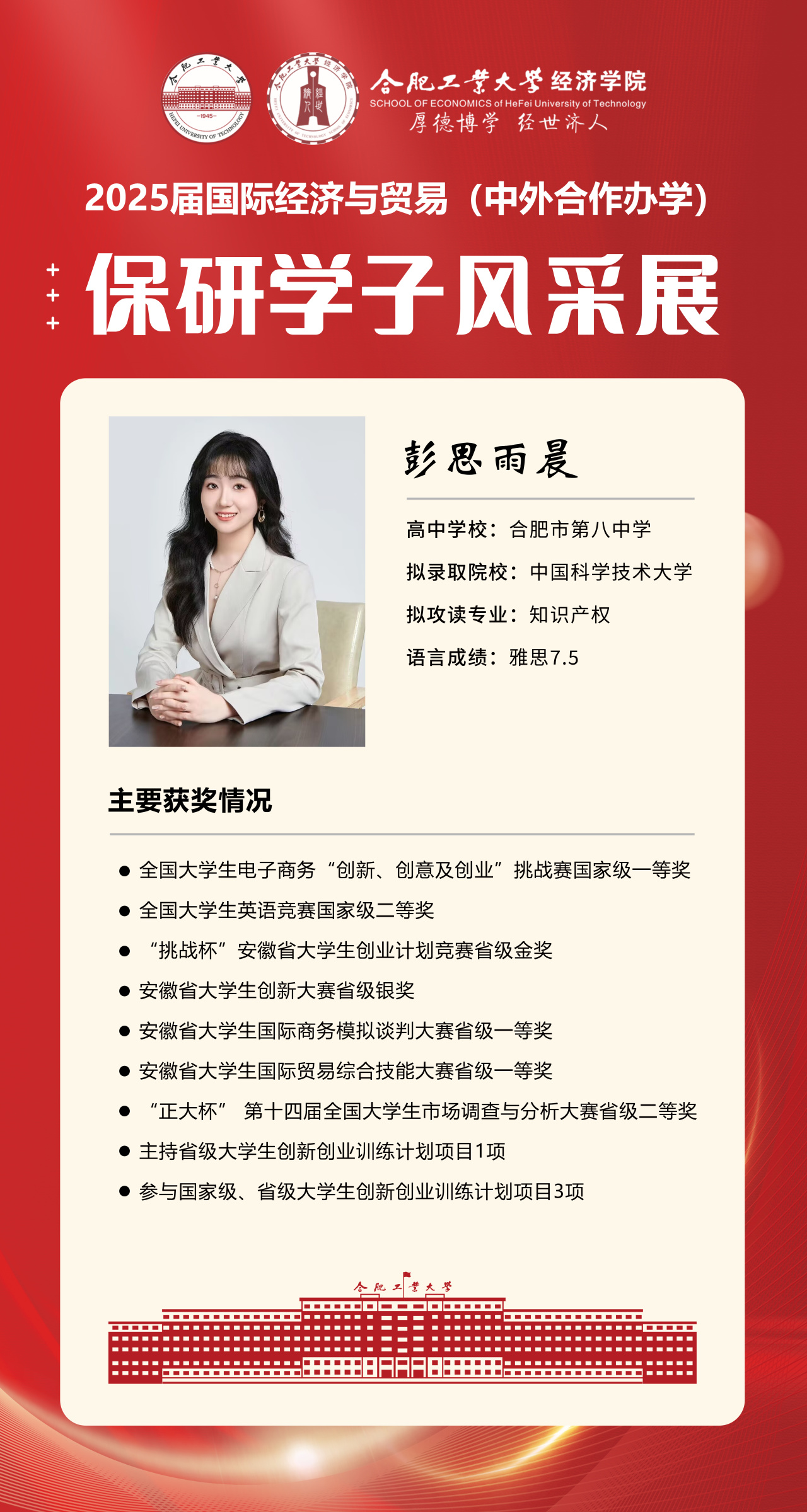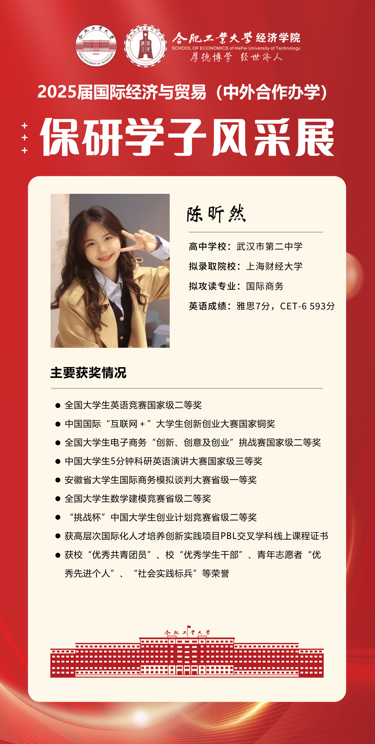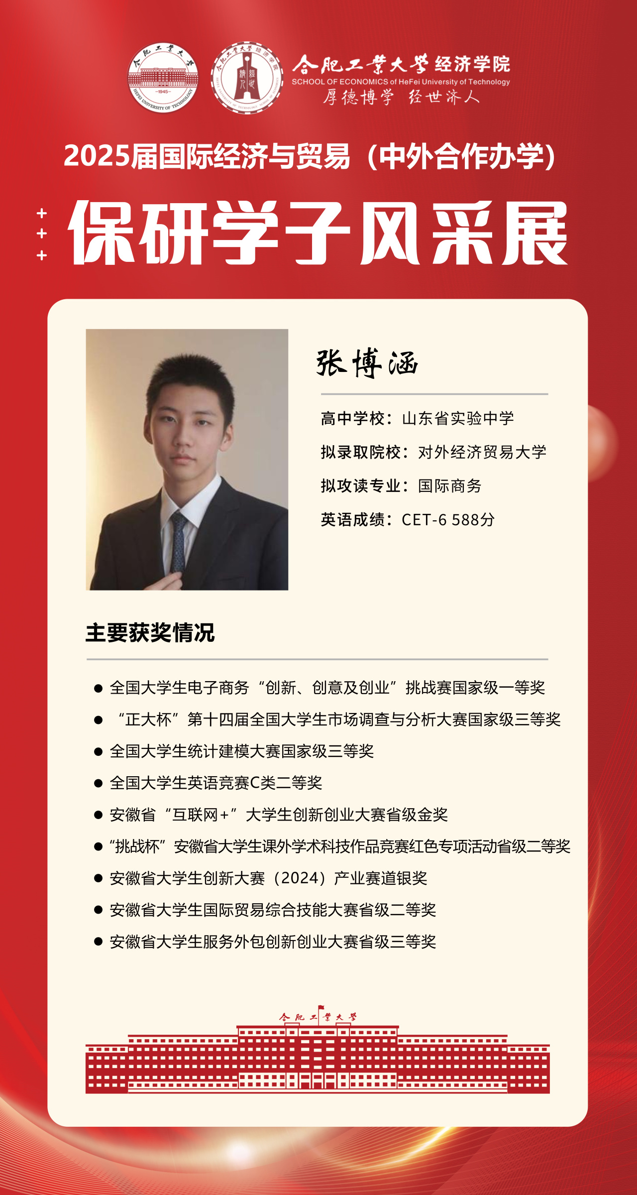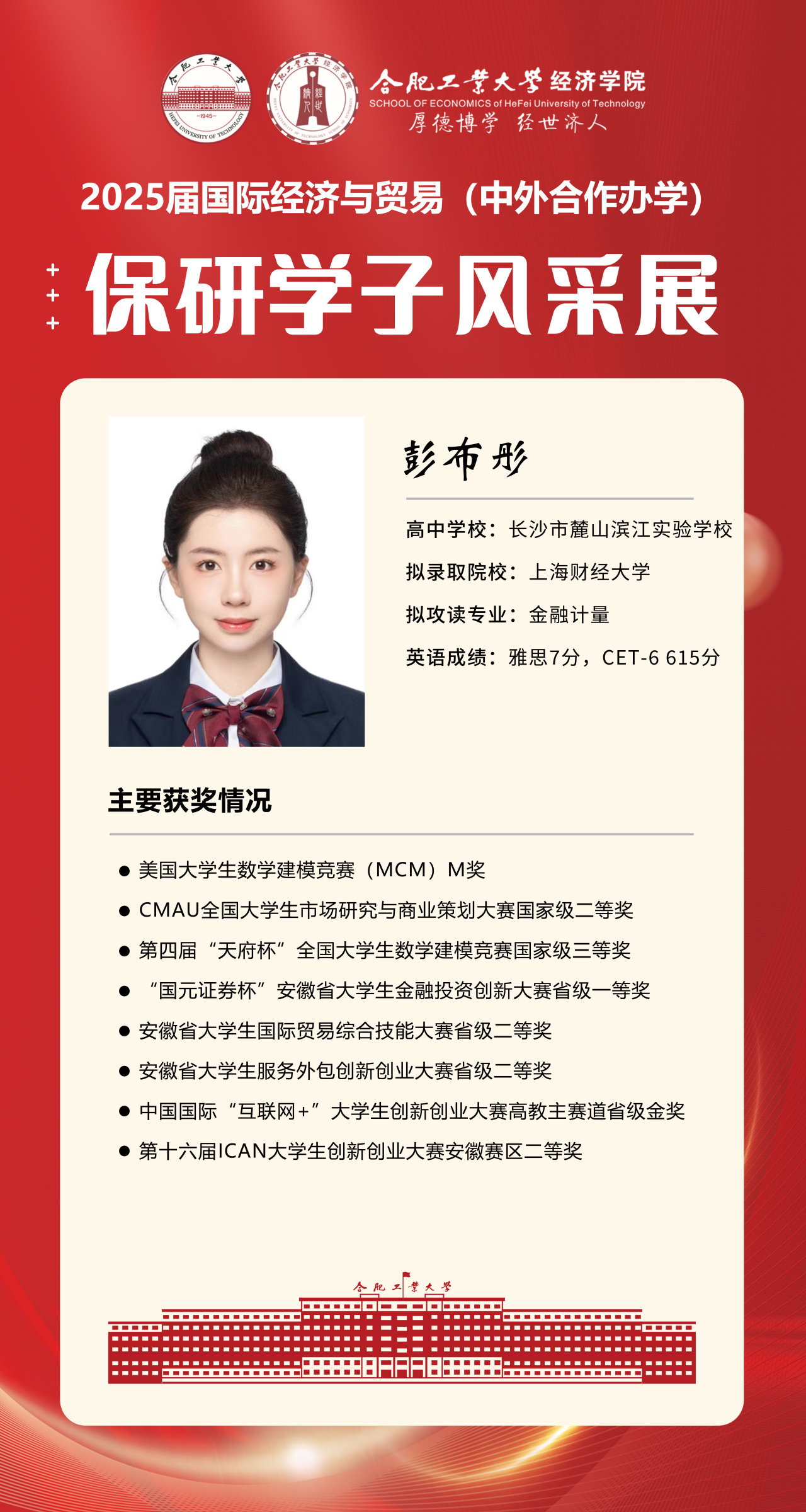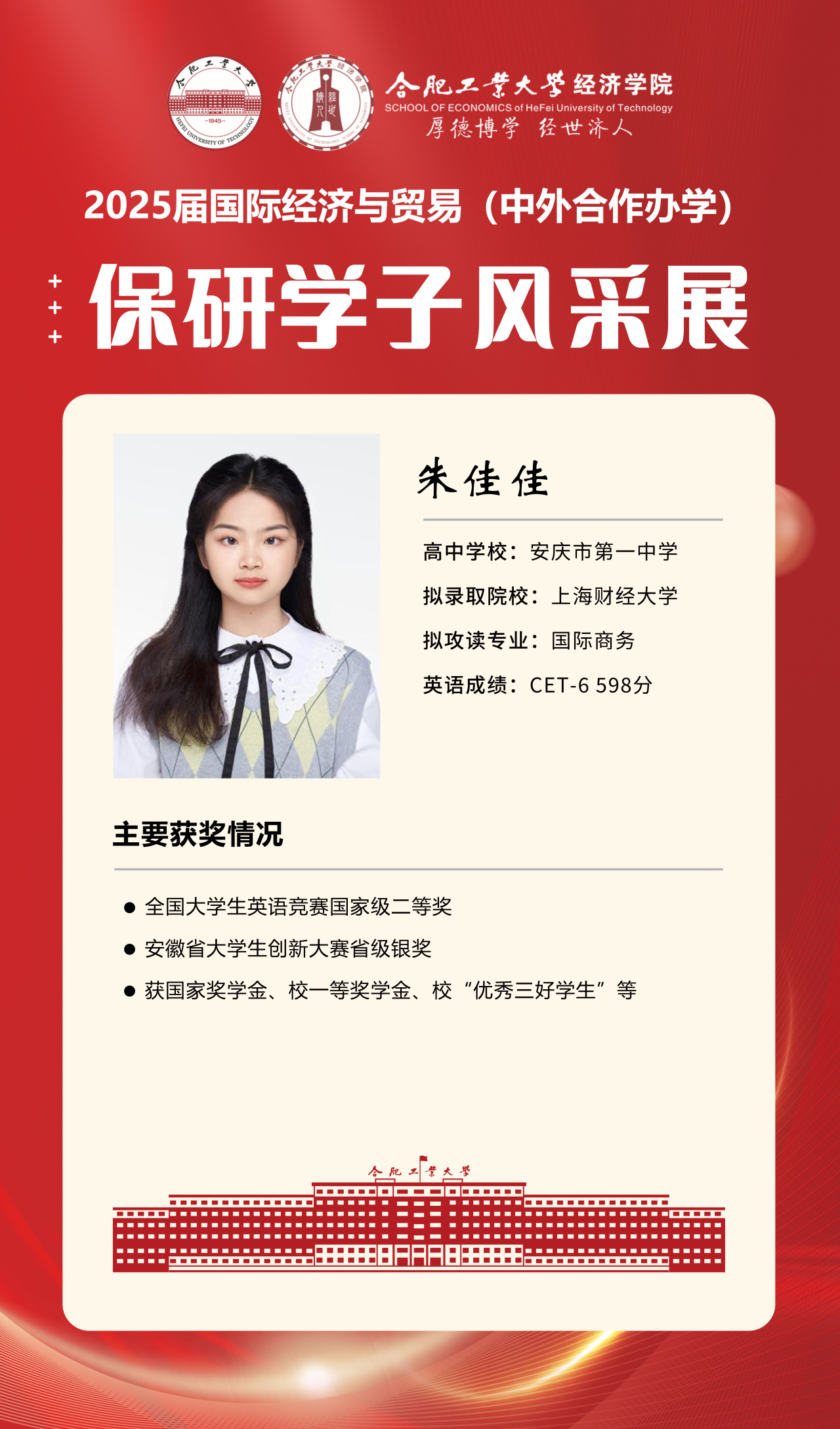 2025届球盟会qmh国际经济与贸易(中外合作办学)15名优秀推免生全部成功推免至中国科学技术大学、上海财经大学、对外经济贸易大学等“双一流”名校继续深造,充分展现了“强语言、精专业、通规则、能跨界”的培养特色。下面我们一起来看看推免学子的风采吧!
