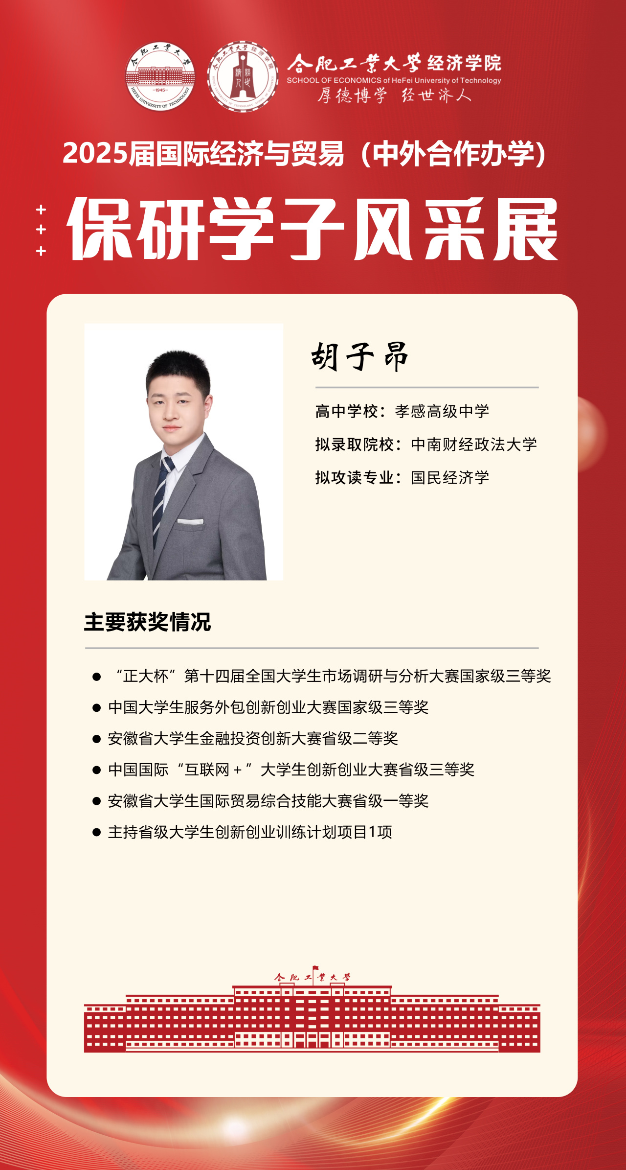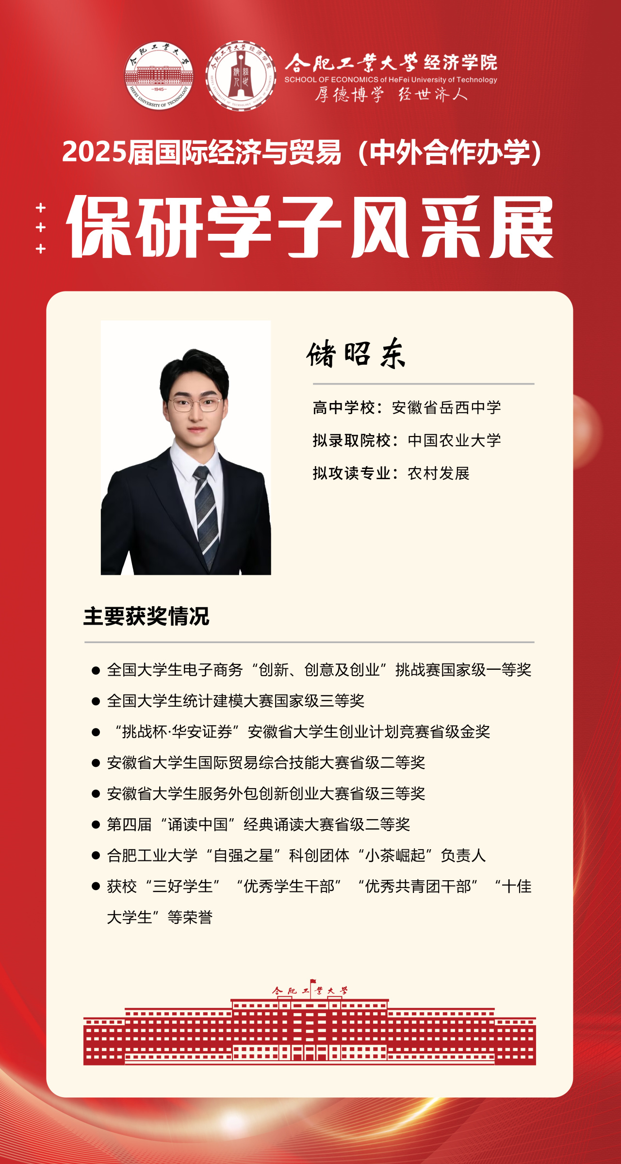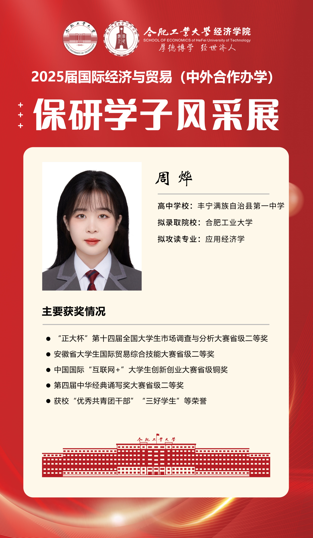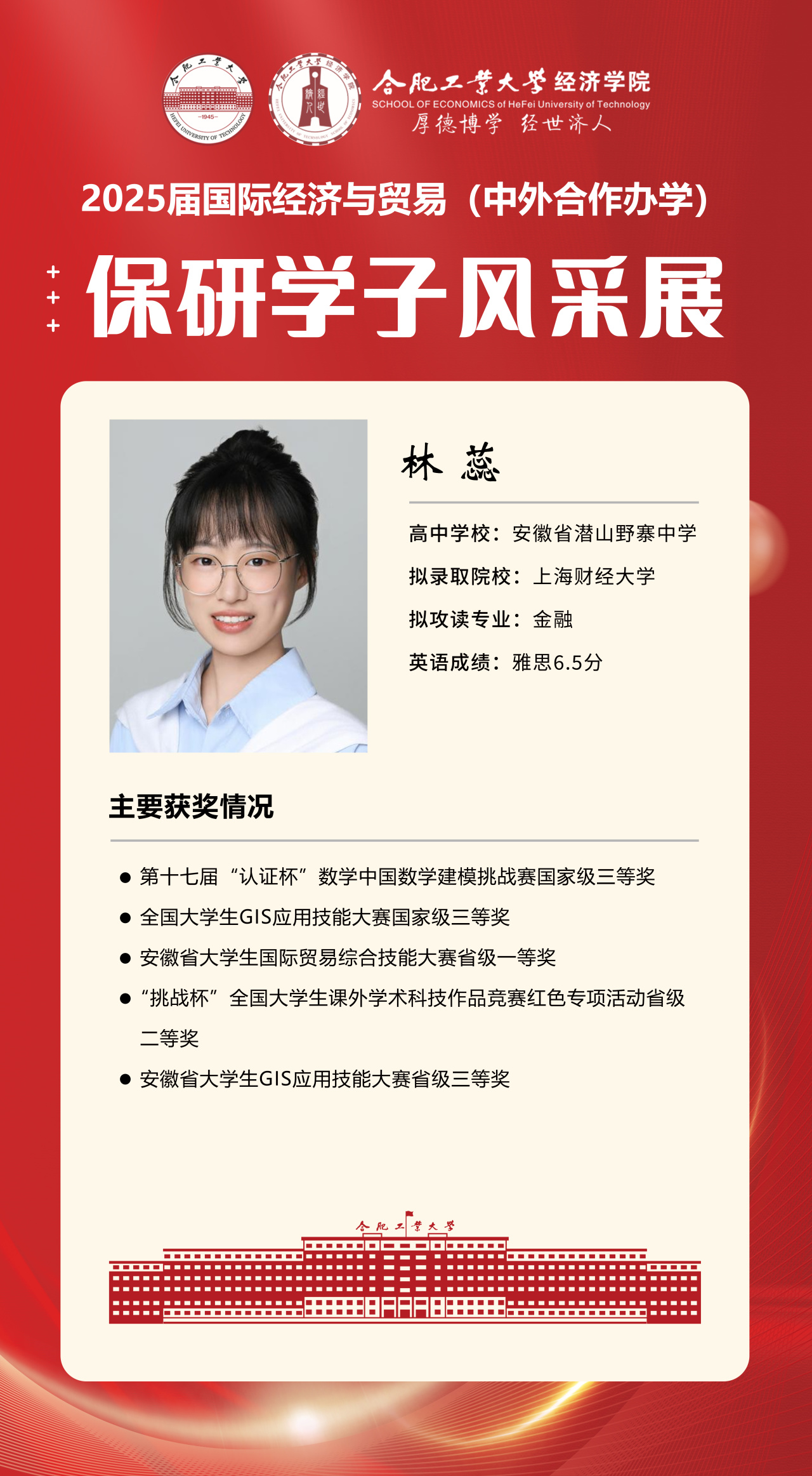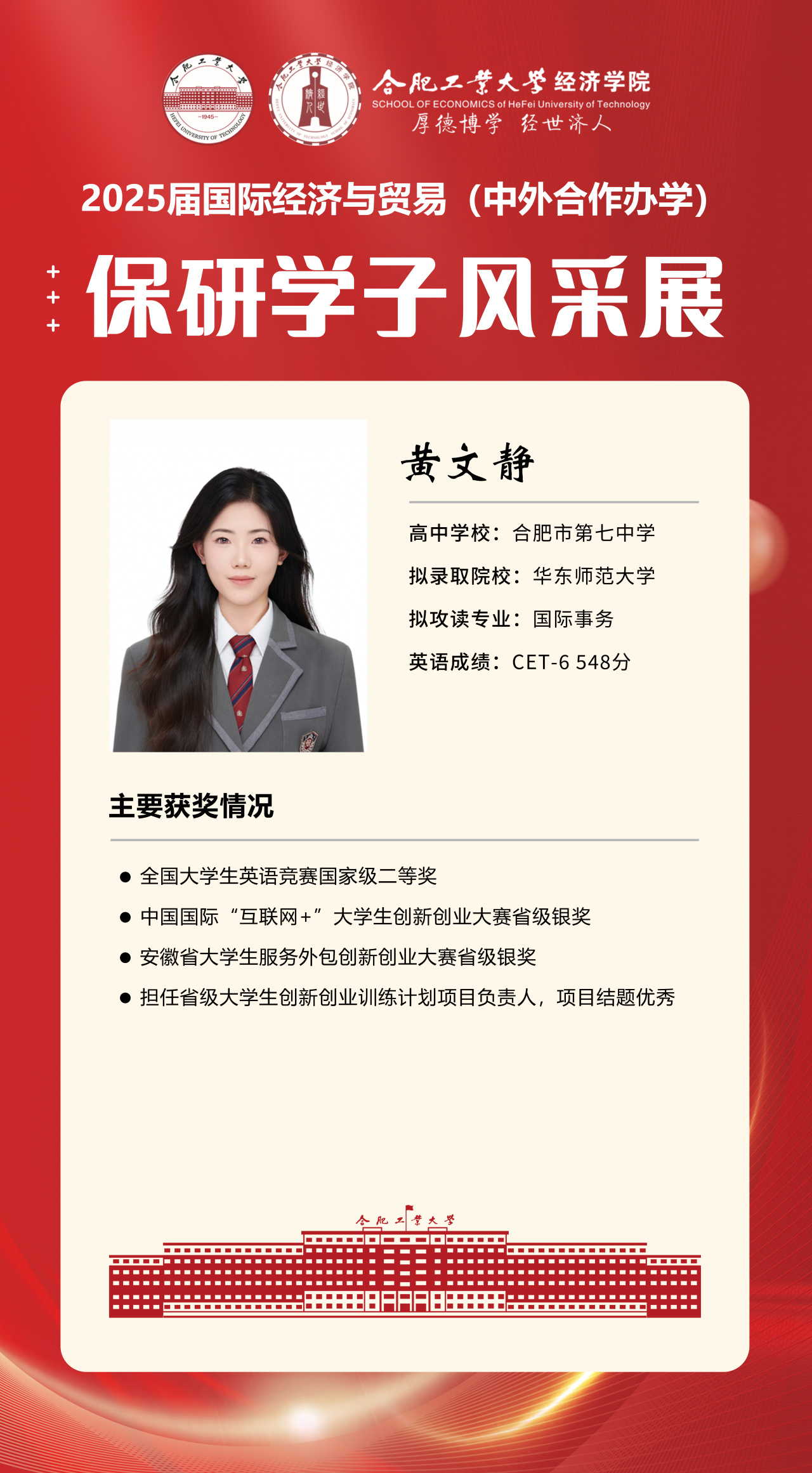 2025届球盟会qmh国际经济与贸易(中外合作办学)15名优秀推免生全部成功推免至中国科学技术大学、上海财经大学、对外经济贸易大学等“双一流”名校继续深造,充分展现了“强语言、精专业、通规则、能跨界”的培养特色。下面我们一起来看看推免学子的风采吧!