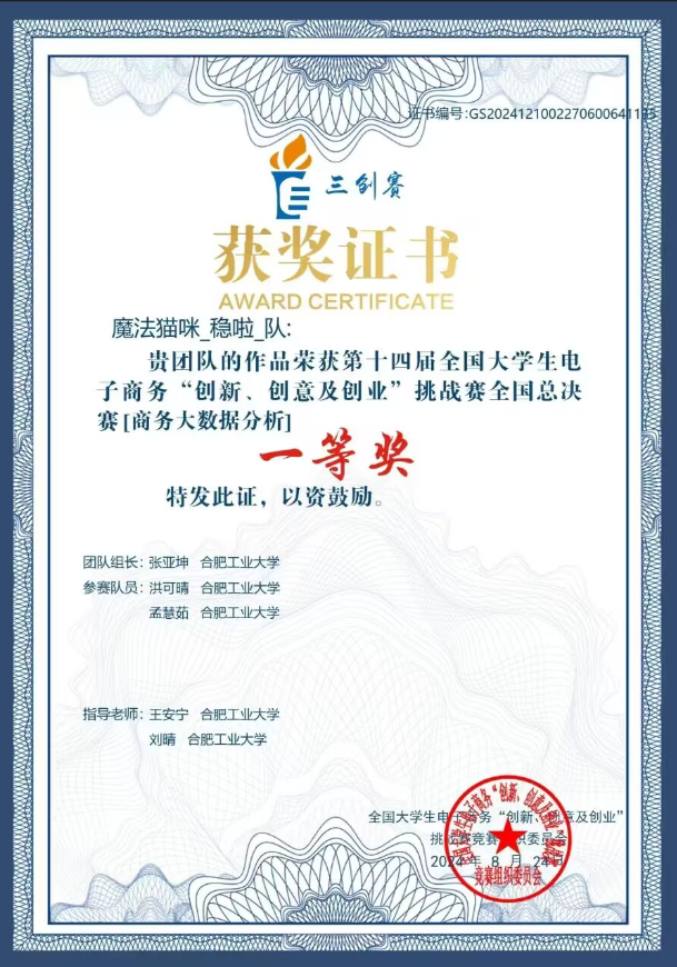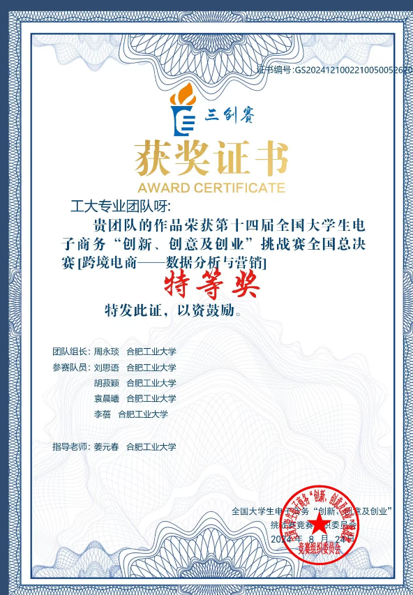 日前,第十四届全国大学生电子商务“创新、创意及创业”挑战赛(以下简称“三创赛”)落下帷幕。qmh官网学子取得可喜成绩,袁晨曦参与的 “工大专业团队呀”团队的参赛作品《女装品类评论数据的细粒度情感分析与数字营销实践》在跨境电商数据分析与营销实战赛中荣获特等奖,宋士哲领衔的“光欢乐社团队”的参赛作品《茶物荟萃——让东方茶韵扬帆出海》在跨境电商跨境直播实战赛中荣获一等奖,张亚坤领衔的“魔法猫咪_稳啦_队”团队的参赛作品《More Than Lemon——二手平台交易效率与交易意愿研究》在商务大数据分析实战赛中荣获一等奖,