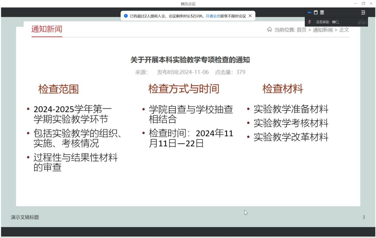 11月7日晚,qmh球盟会亚博网址积极响应我校2024年关于开展本科实验教学专项检查工作部署要求,通过腾讯会议线上开展实验教学规范化自查自纠工作部署。此次会议旨在传达学校专项检查工作精神,进一步提升实验教学质量。qmh官网20余名实验课程教师参与会议,会议由实验中心主任娜仁主持。