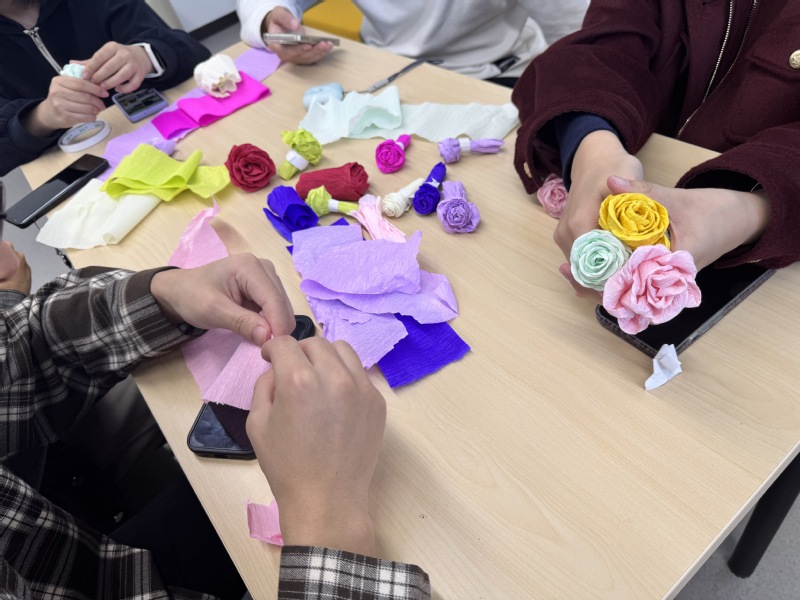 第三期活动以“折纸之韵,花艺之美”为主题,在同学们的精心折叠下,看似平凡无奇的纸张,经过裁剪、折纸、涂胶、定型等步骤,一个个花蕊、花瓣、花杆慢慢浮入眼帘,一张张纸被巧妙地折叠成形态各异、栩栩如生的褶皱纸花,通过不同的颜色组合和搭配,创作出独一无二、色彩斑斓的花艺作品。
