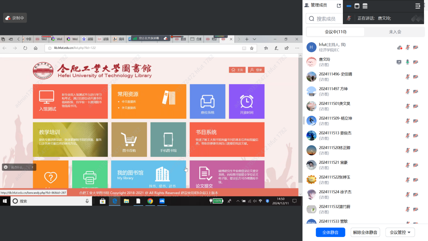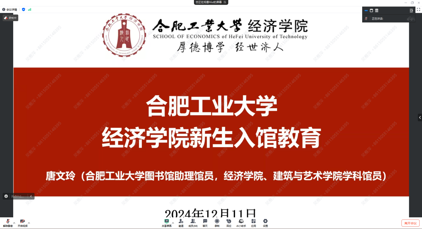 本次讲座通过腾讯线上会议的方式举行,由图书馆资深馆员唐文玲老师主持。首先,唐老师向新生们介绍了图书馆的空间布置和自助设施,包括借阅区、自习室、电子阅览室以及各类学习辅导区。她强调了图书馆作为学术资源中心的重要性,并鼓励学生们充分利用这些资源来辅助学习和研究。
