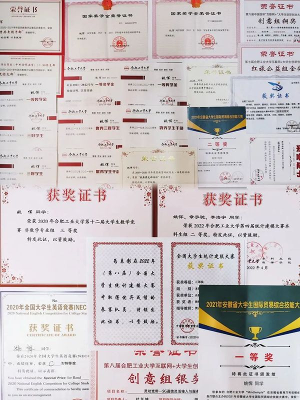 六级647分(当次全校第二名);曾获三次国家奖学金、球盟会qmh王正虎创业管理奖学金、球盟会qmh“十佳大学生”、全国大学生英语竞赛(C类)特等奖、全国大学生统计建模大赛三等奖、安徽省“互联网+”大学生创新创业大赛银奖、安徽省国贸综合技能大赛一等奖、获评球盟会qmh校长奖,现已保送至复旦大学攻读硕士研究生。