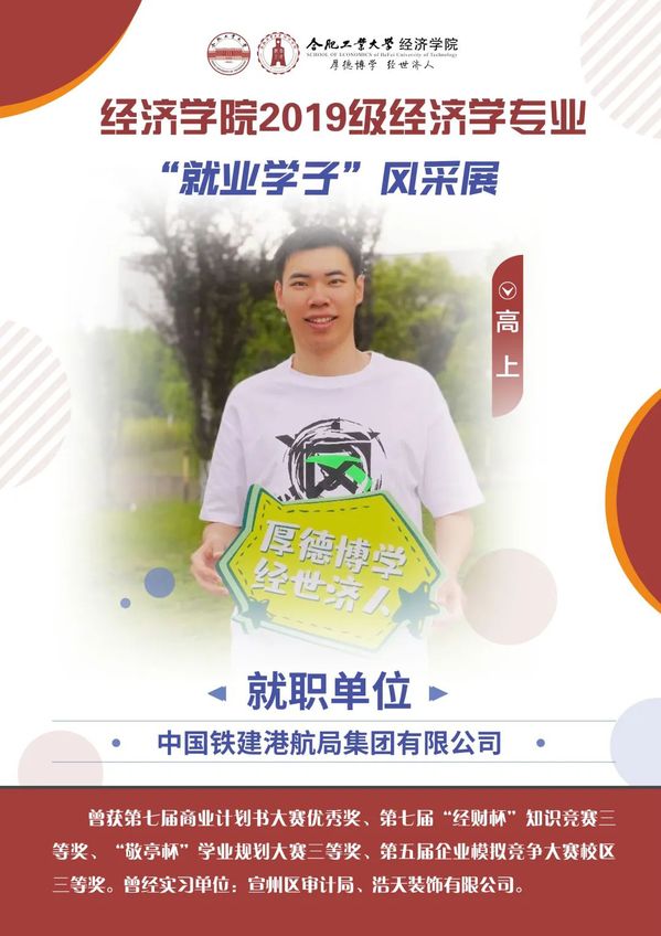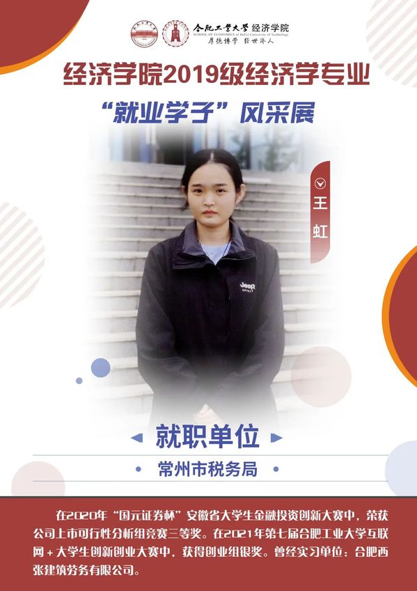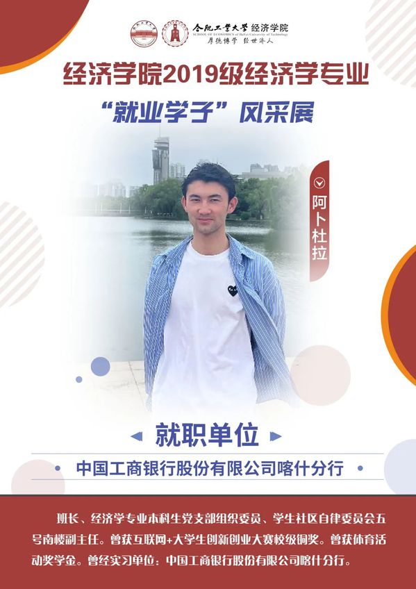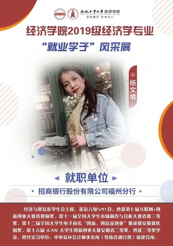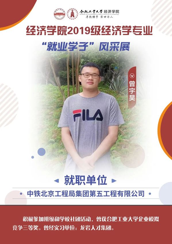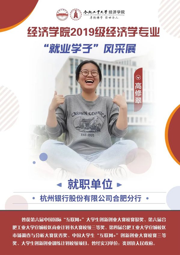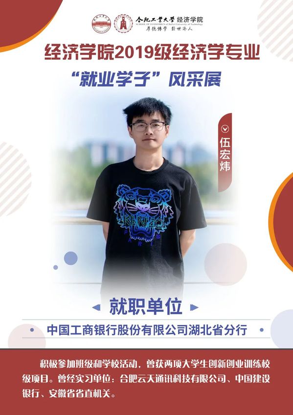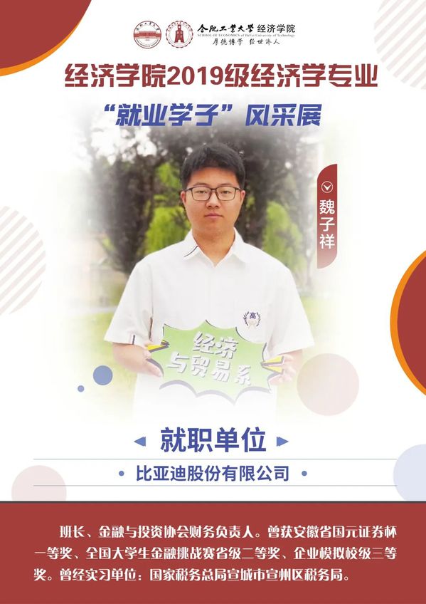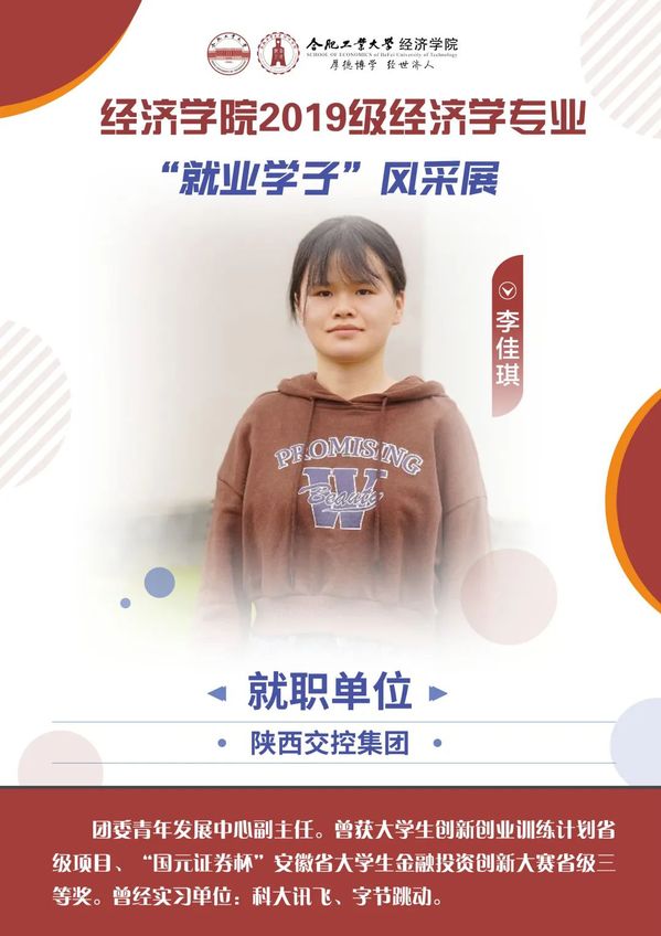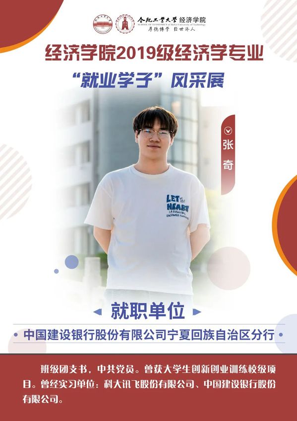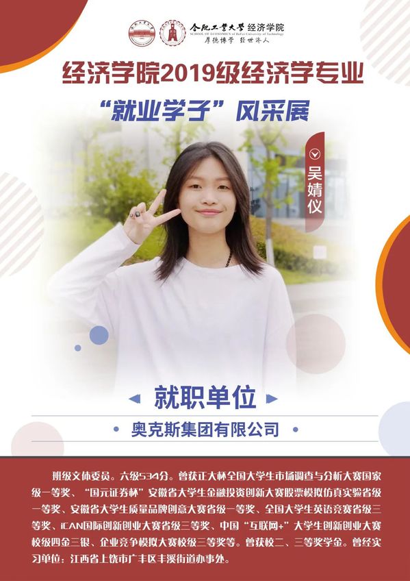 本专业2019级毕业生中,有37位同学被新加坡国立大学、澳大利亚国立大学、英国利兹大学、中国科学技术大学、中央财经大学、吉林大学、北京理工大学、山东大学、湖南大学、南京理工大学、暨南大学、西南财经大学、中南财经政法大学、西北工业大学、上海外国语大学、球盟会qmh等国内外名校录取。在就业分布中,截至目前,有46位同学(已签就业协议)被工农建中四大行、招商银行、海口海关、常州税务局、中建集团、中铁隧道集团、比亚迪、陕西交投、安徽水利等优质单位录用。本期推文带领大家领略部分经济学专业就业学子的风采。