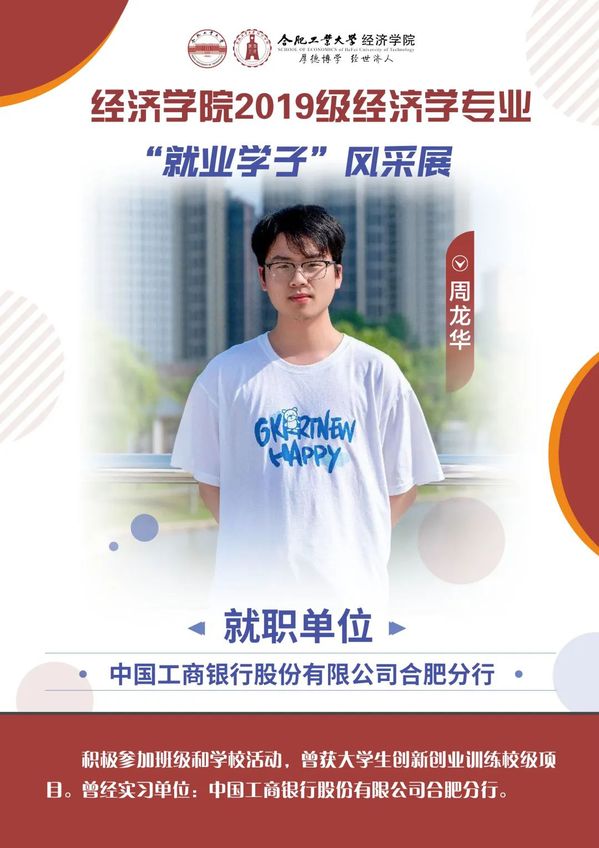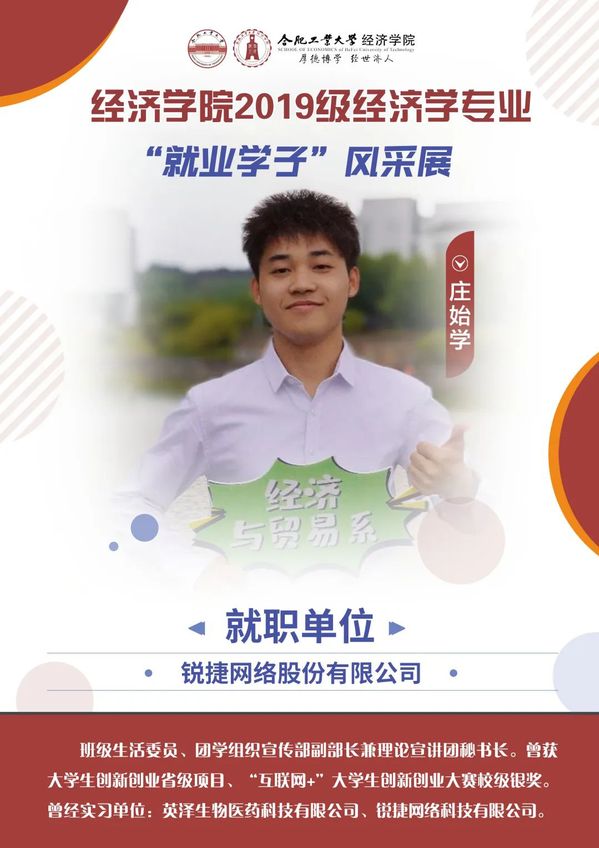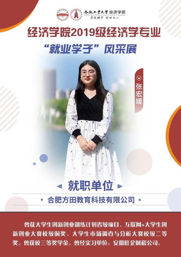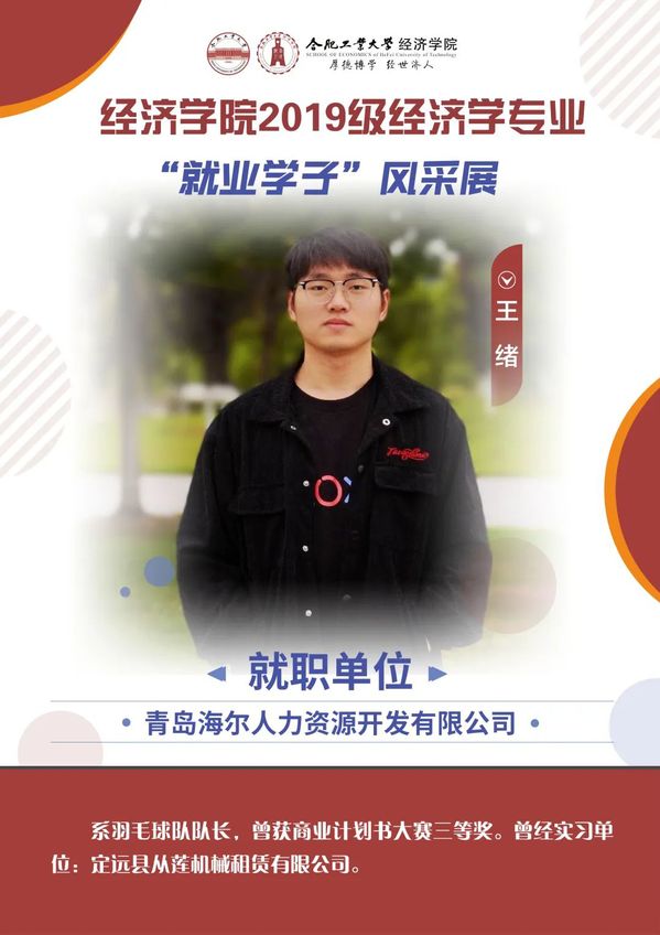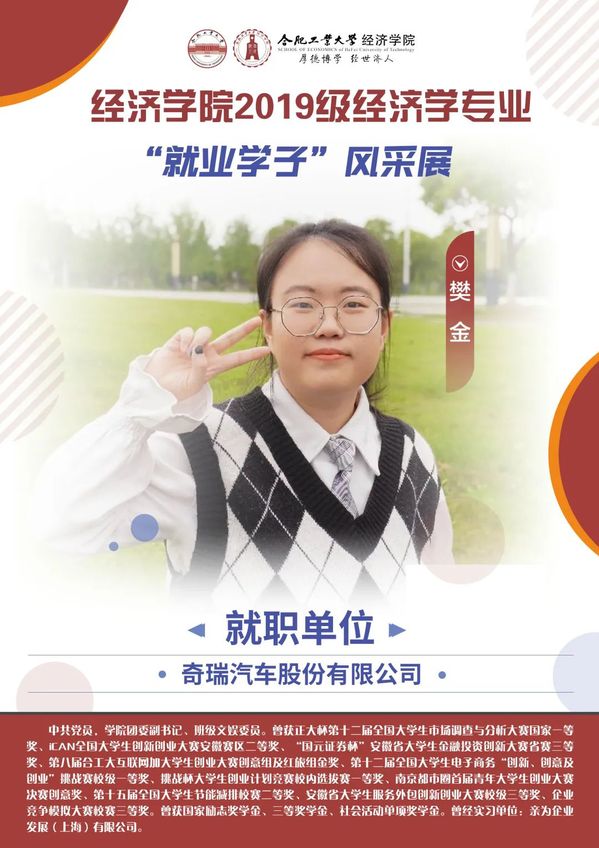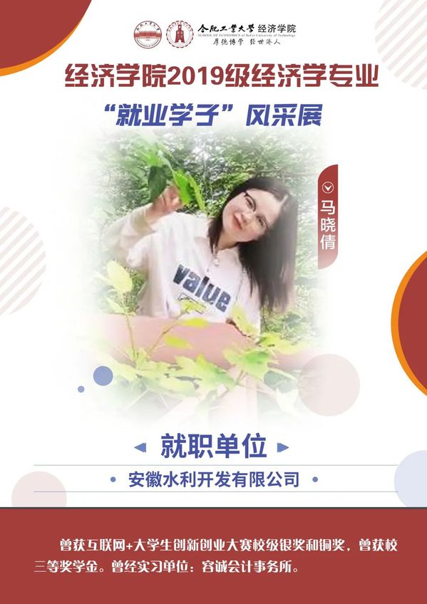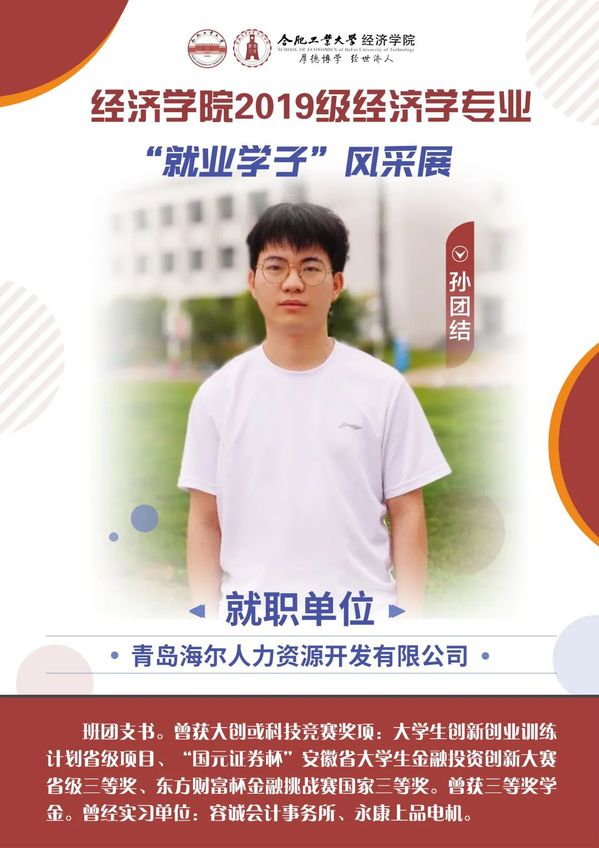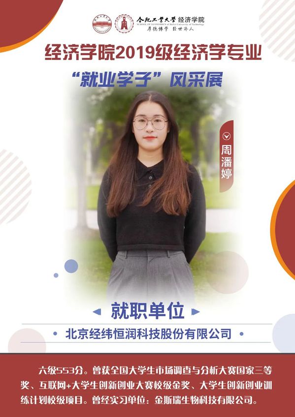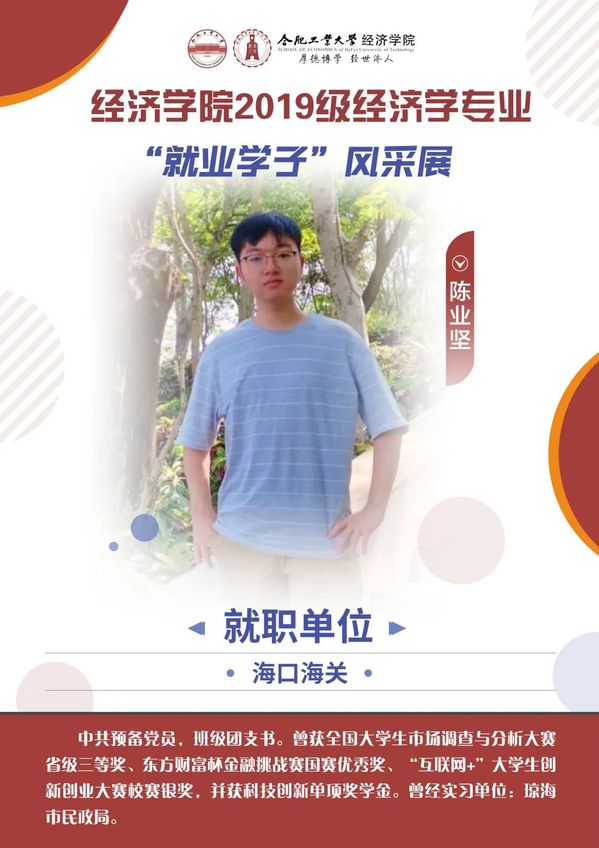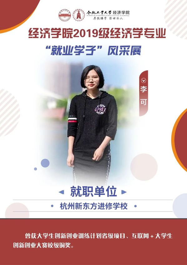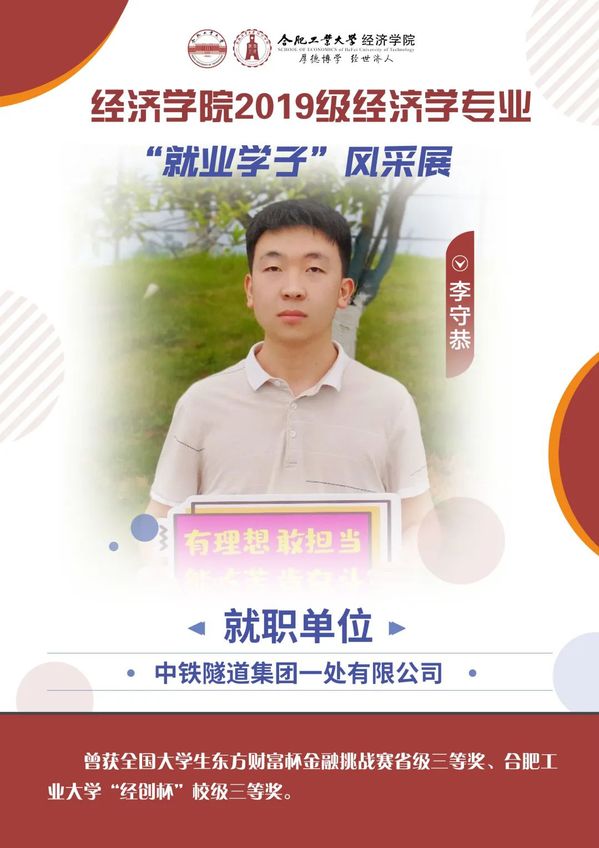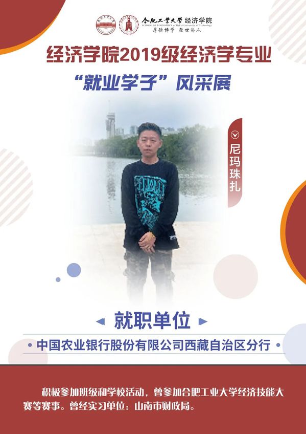 本专业2019级毕业生中,有37位同学被新加坡国立大学、澳大利亚国立大学、英国利兹大学、中国科学技术大学、中央财经大学、吉林大学、北京理工大学、山东大学、湖南大学、南京理工大学、暨南大学、西南财经大学、中南财经政法大学、西北工业大学、上海外国语大学、球盟会qmh等国内外名校录取。在就业分布中,截至目前,有46位同学(已签就业协议)被工农建中四大行、招商银行、海口海关、常州税务局、中建集团、中铁隧道集团、比亚迪、陕西交投、安徽水利等优质单位录用。本期推文带领大家领略部分经济学专业就业学子的风采。