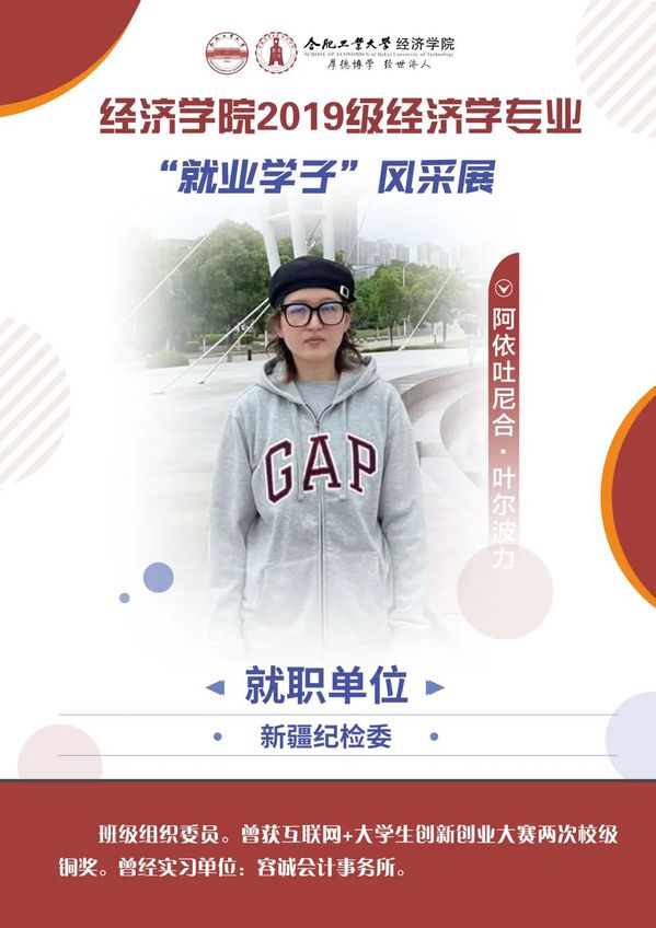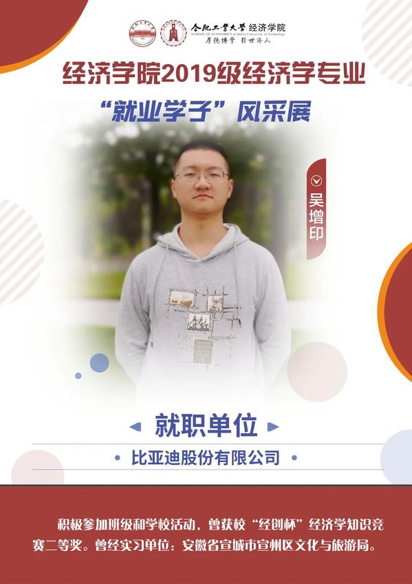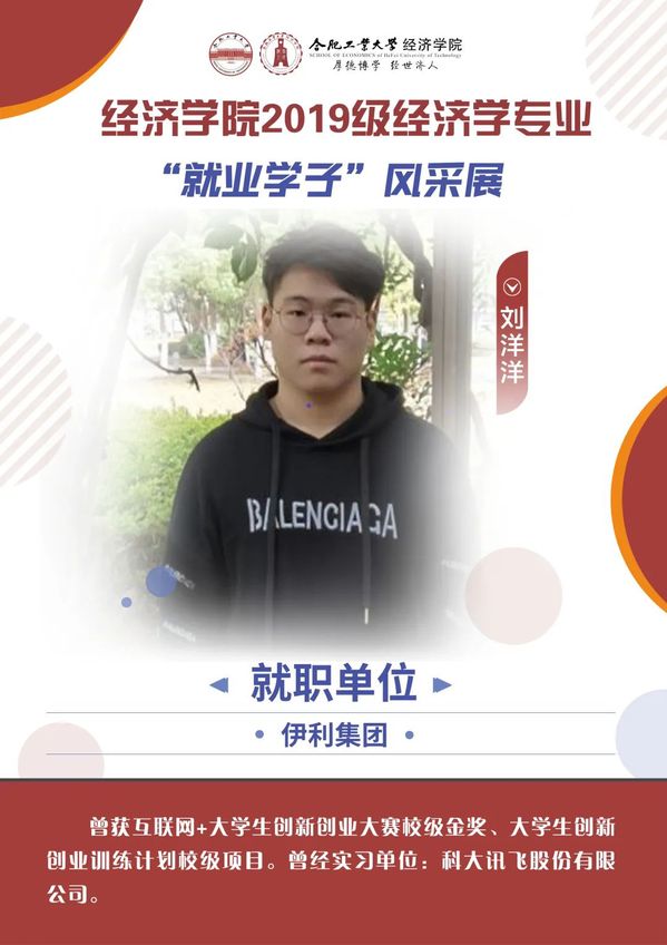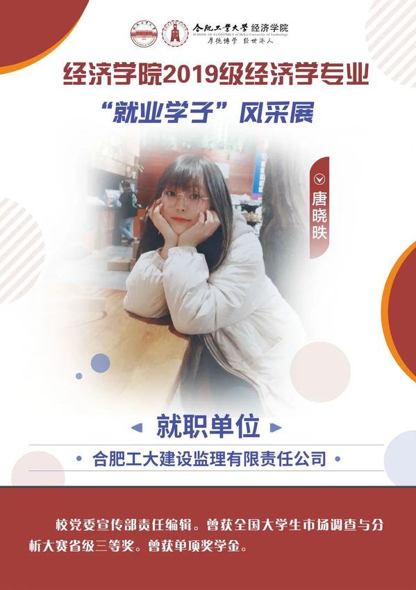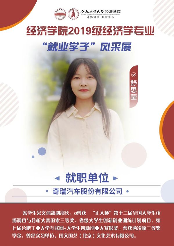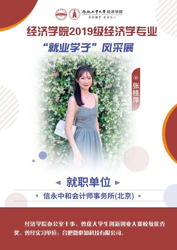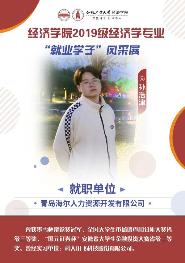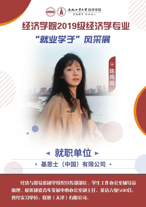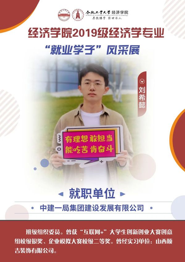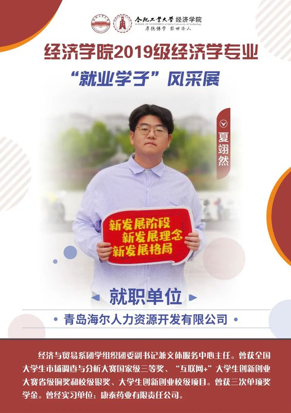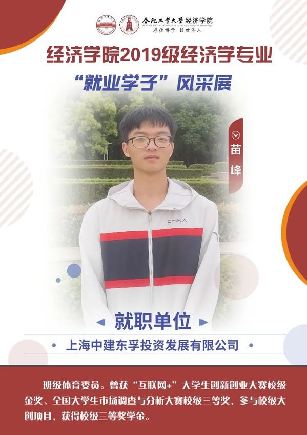 本专业2019级毕业生中,有37位同学被新加坡国立大学、澳大利亚国立大学、英国利兹大学、中国科学技术大学、中央财经大学、吉林大学、北京理工大学、山东大学、湖南大学、南京理工大学、暨南大学、西南财经大学、中南财经政法大学、西北工业大学、上海外国语大学、球盟会qmh等国内外名校录取。在就业分布中,截至目前,有46位同学(已签就业协议)被工农建中四大行、招商银行、海口海关、常州税务局、中建集团、中铁隧道集团、比亚迪、陕西交投、安徽水利等优质单位录用。本期推文带领大家领略部分经济学专业就业学子的风采。