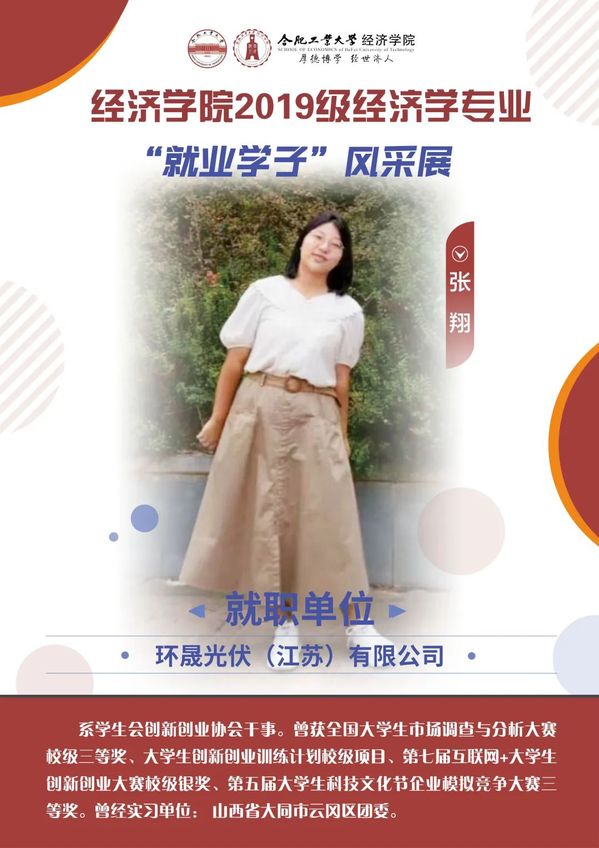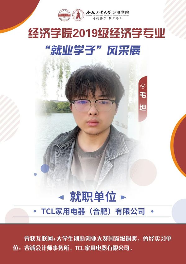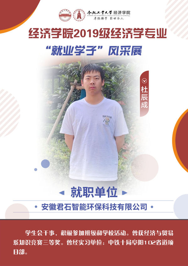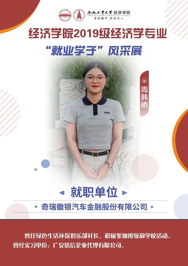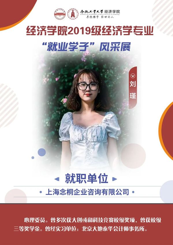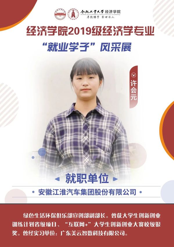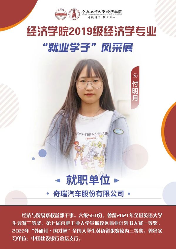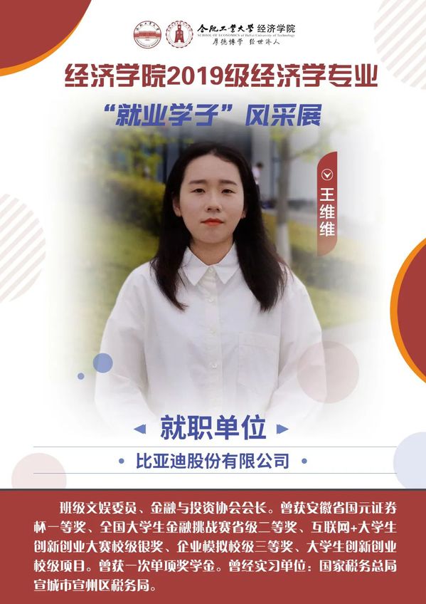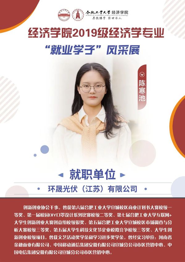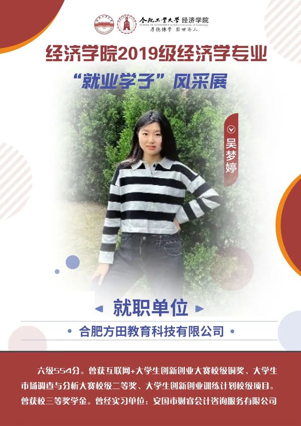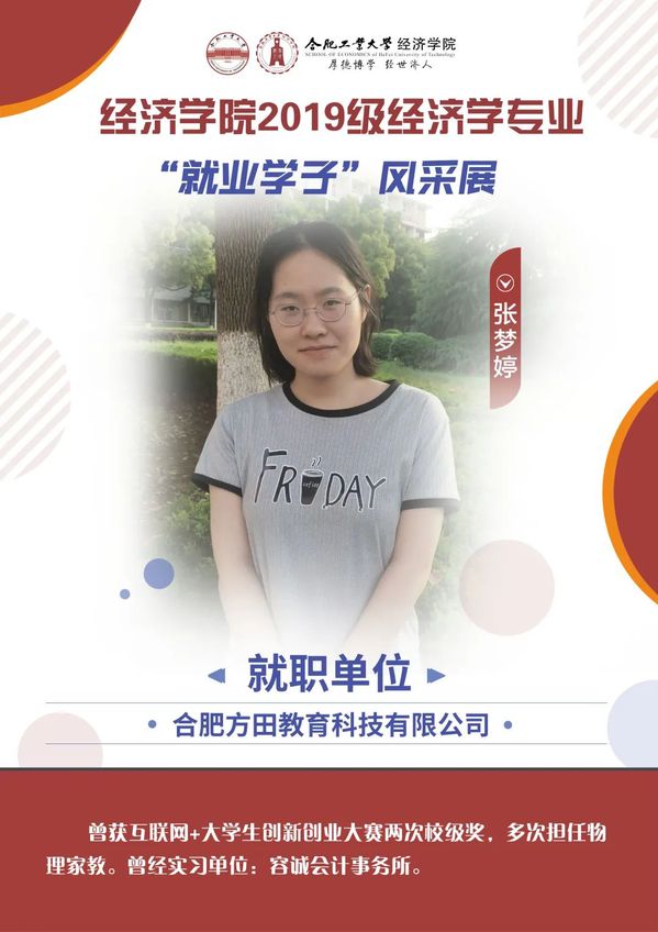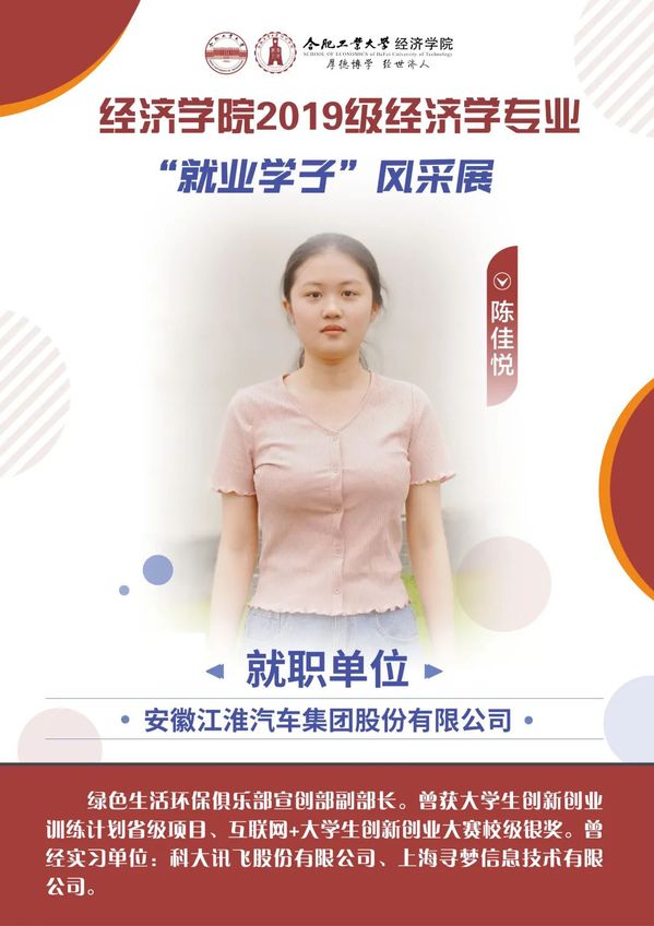 本专业2019级毕业生中,有37位同学被新加坡国立大学、澳大利亚国立大学、英国利兹大学、中国科学技术大学、中央财经大学、吉林大学、北京理工大学、山东大学、湖南大学、南京理工大学、暨南大学、西南财经大学、中南财经政法大学、西北工业大学、上海外国语大学、球盟会qmh等国内外名校录取。在就业分布中,截至目前,有46位同学(已签就业协议)被工农建中四大行、招商银行、海口海关、常州税务局、中建集团、中铁隧道集团、比亚迪、陕西交投、安徽水利等优质单位录用。本期推文带领大家领略部分经济学专业就业学子的风采。