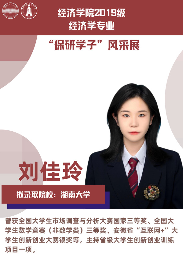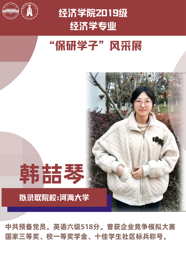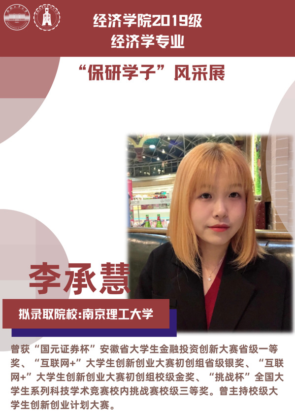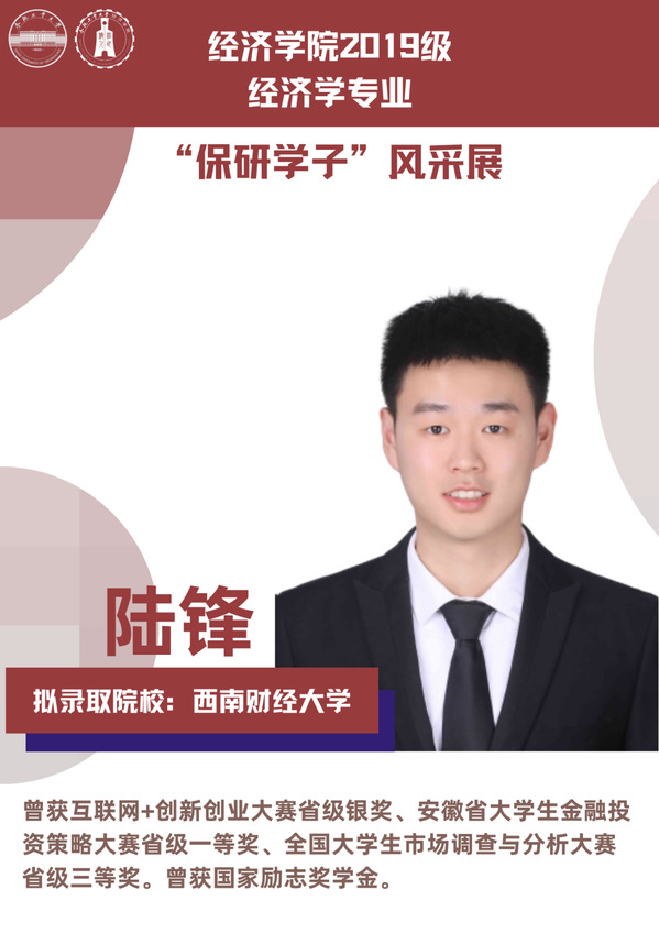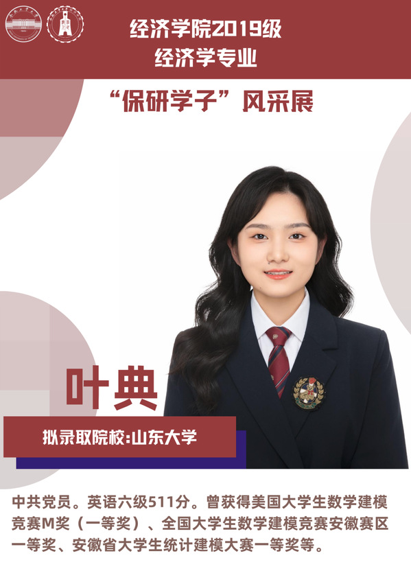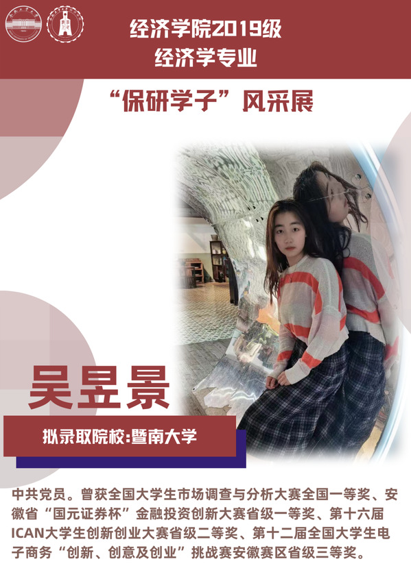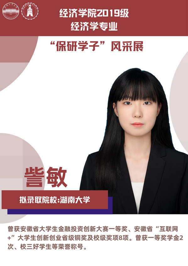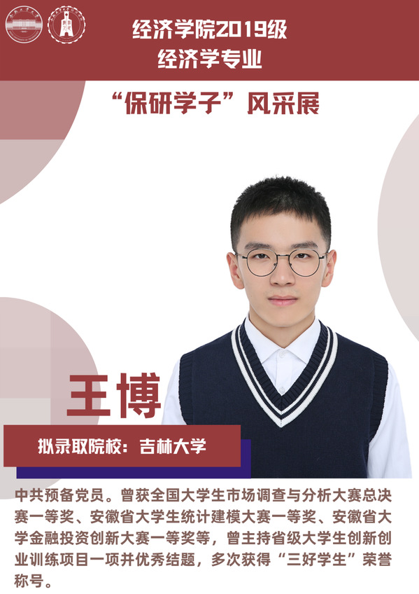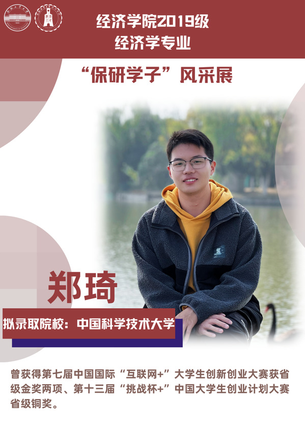 球盟会qmh经济学专业前身为贸易经济专业,1999年更名为经济学专业,2012年宣城校区同步招生。2021年中央赛道评审中,获批“省级一流本科专业建设点”。同年与美国克拉克大学本硕博贯通式联合培养机制正式落地。本专业顺应人工智能、数字经济与新经济的时代要求,以“经济分析与数字治理”为特色方向,培养能够熟练应用现代经济分析工具和数字经济理论及技术,为政府、企事业部门提供经济分析、预测与治理的新文科高素质专业人才。2019级经济学专业学生中,19名推免生被中国科学技术大学、中央财经大学、吉林大学、北京理工大学等国内名校拟录取。本期推文将带领大家共同领略2019级经济学专业“保研学子”的风采。
