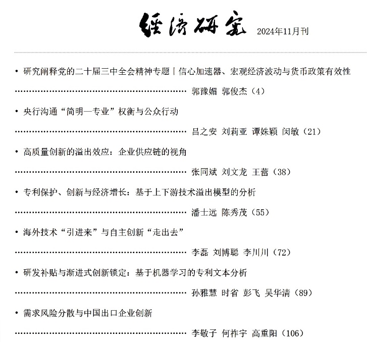 近日,qmh官网孙雅慧老师为第一作者的论文《研发补贴与渐进式创新锁定:基于机器学习的专利文本分析》在《经济研究》2024年第11期发表(通讯作者:时省;合作者:彭飞、吴华清)。本论文得到国家社会科学基金重大项目(18ZDA064)、国家自然科学基金青年项目(72004052)、国家自然科学基金面上项目(72273038)、教育部人文社会科学研究青年基金项目(24YJC790156)和安徽省自然科学基金青年项目(2408085QG219)的资助。《经济研究》由中国社会科学院经济研究所主办,是综合性经济理论类权威期刊,致力于发表关于中国特色社会主义经济建设事业中重大现实问题的高水平理论研究类文章,2023年的复合影响因子为20.288