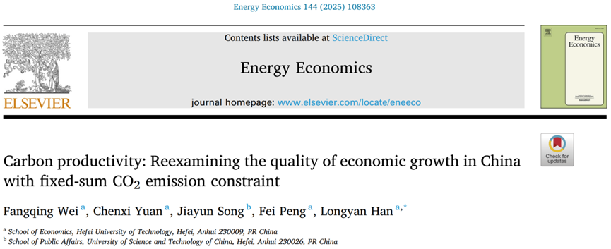 魏方庆副教授与2021级经济学本科生袁晨曦(保研至中国科学技术大学),在《Energy Economics》(JCR 1区,ABS三星)发表论文《Carbon productivity: Reexamining the quality of economic growth in China with fixed-sum CO2 emission constraint》(2025年3月,合作者:宋佳云,彭飞,韩龙艳)。该文创新性提出了考虑技术进步性和碳排放固定和约束的EEFDEA-DDF-SMLPI方法,并运用该方法实证研究了中国2012-2021年的碳生产率增长及其驱动因素,为提高碳生产率进而促进高质量发展提供了重要参考。