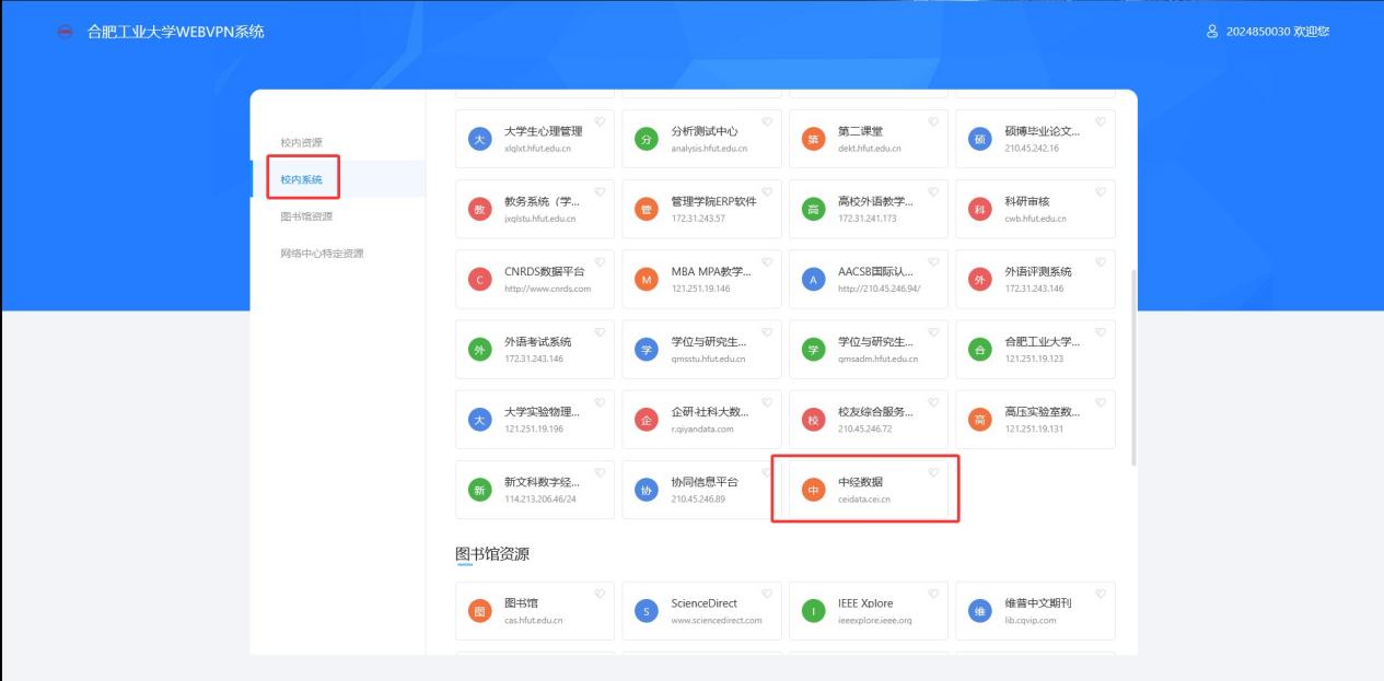 登录球盟会qmhWEBVPN系统,进入“校内系统”模块,找到“中经数据”点击平台进入使用。