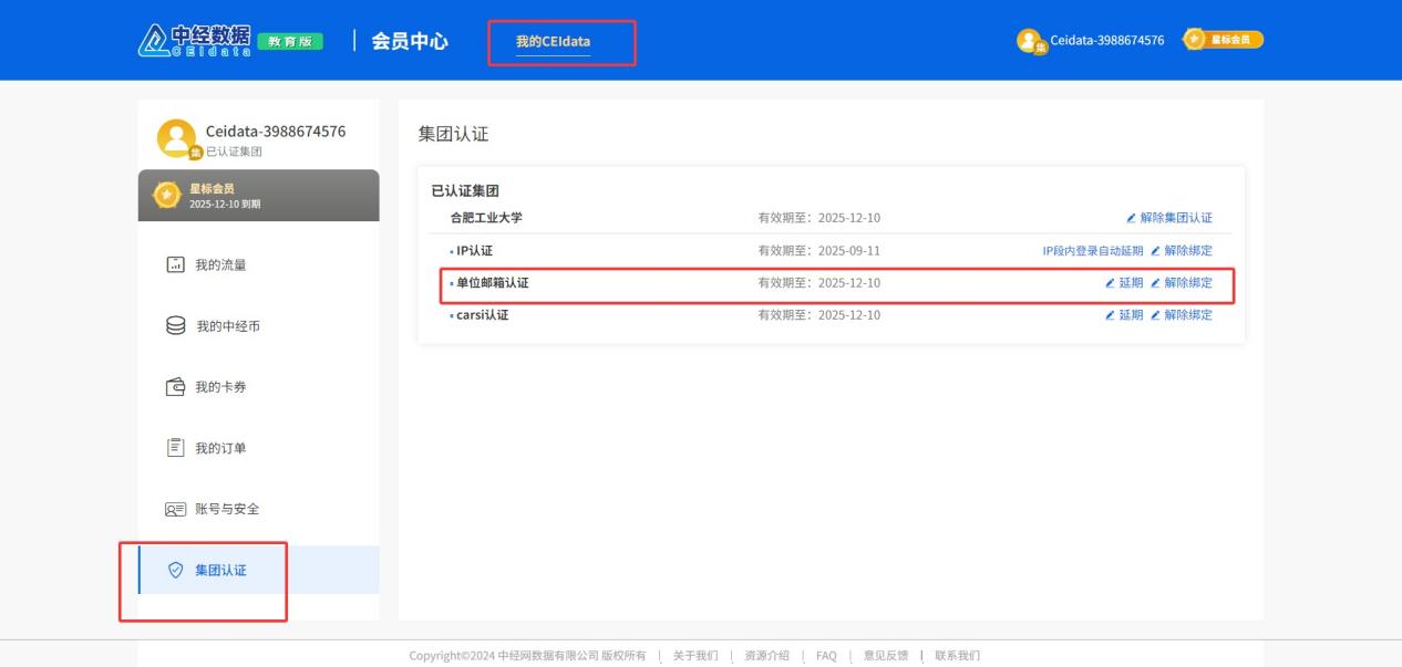 第三种:单位邮箱(edu 邮箱)认证。登录个人会员账号后,点击首页右上角“会员中心”,进入【我的CEIdata - 集团认证】页面,点击【去认证】,在弹窗输入框中输入 “球盟会qmh”并点击查询,选择【单位邮箱认证】,输入您的 “@hfut.edu.cn”邮箱地址,最后登录邮箱点击激活链接完成认证。