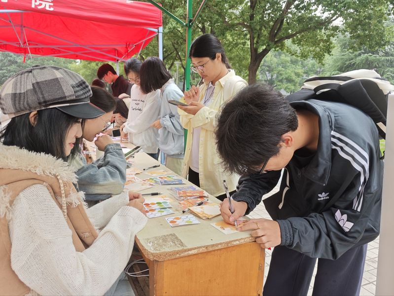 本次活动共设有“盛世华章·同心筑梦”、“你的月亮我的心,纸笔写尽思乡情”以及“地图大发现,乡音问答赛”三大环节,吸引了众多同学踊跃参与。在国庆主题区,同学们在书签上写下对祖国的真挚祝福;中秋主题区则弥漫着浓浓的思乡之情,同学们在卡片上留下身为游子对故乡的深深眷恋与美好祈愿。乡音问答环节更是妙趣横生,同学们积极互动,现场笑语不断,将整个活动的气氛推向高潮。